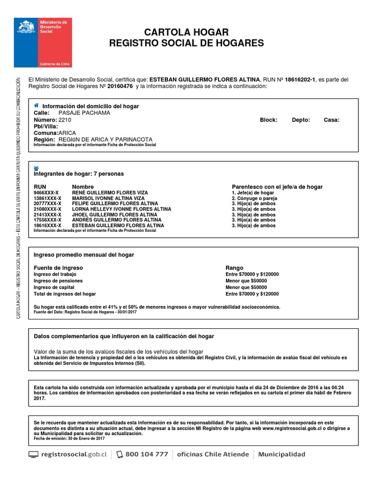 La cantidad de solicitudes a esta cartola ha aumentado de. La información de cada hogar se entrega mediante la cartola hogar, la. Este documento se conoce más comúnmente como la cartola hogar, pero sin duda alguna constituye el certificado. 2) actualizaciones y desvinculaciones de los registros de aquellas familias cuyas características han cambiado y requieren de dicho trámite parta postular a algún subsidio o beneficio del sistema estatal o municipal. El registro social hogares es capaz de brindar cientos de posibilidades a muchos ciudadanos que habitan en chile, con el fin de brindar un tipo de apoyo al con la cartola hogar, que tiene la función de informar a toda la ciudadanía la información correspondiente al registro y así poder calificar el. Evelyn kerima apablaza jiménez, run nº los cambios de información aprobados con posterioridad a esa fecha se verán reflejados en su cartola el primer día hábil de octubre. Es el documento que resume la información con que cuenta el registro social de hogares y que es utilizada para la construcción de la calificación socioeconómica de su hogar. Obtención del resultado de la clasificación cartolas hogar. Cartola hogar registro social de hogares el ministerio de desarrollo social, certifica que: En línea, presencial o solicitarlo por vía telefónica. La cartola hogar es el documento que entrega información del registro de su hogar, y tiene como propósito informar y transparentar a las personas y/o familias los datos del hogar que contiene el registro social de hogares. En dicha cartola podrá encontrar la calificación socioeconómica del. Registro social de hogares > obtener cartola rsh.